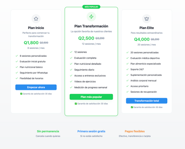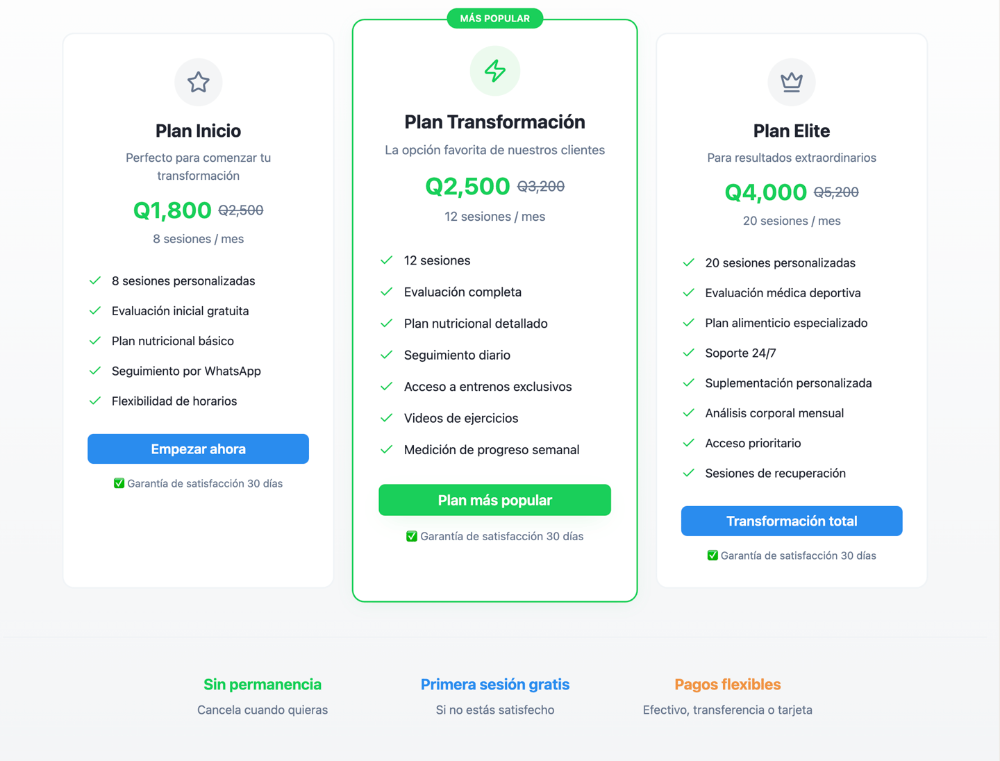 Elige el plan que mejor se adapte a tus objetivos y presupuesto. Todos incluyen entrenamiento a domicilio sin costo adicional.